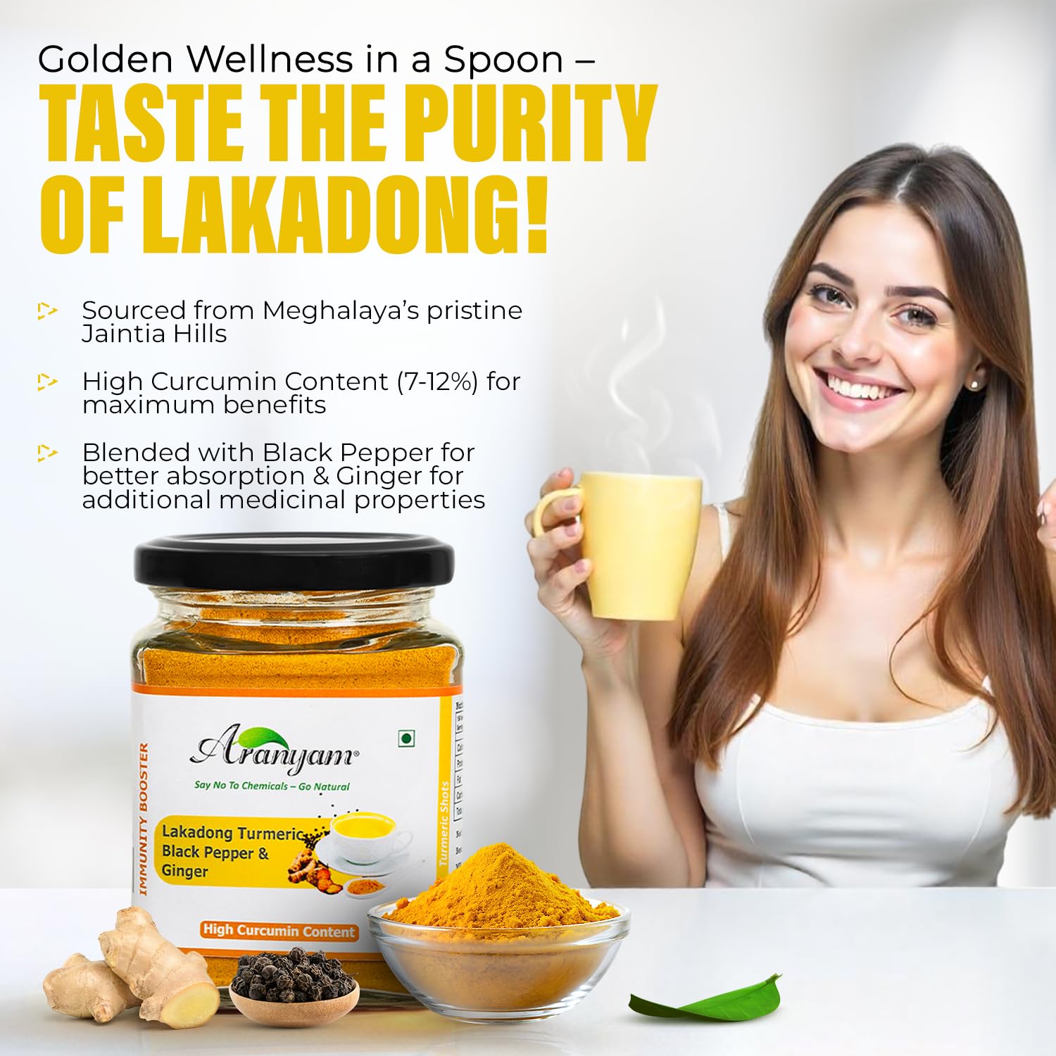 - High Curcumin Content: Sourced from Meghalaya’s Jaintia Hills, this Lakadong turmeric latte mix contains 7-12% curcumin, blended with black pepper & ginger for enhanced absorption and wellness